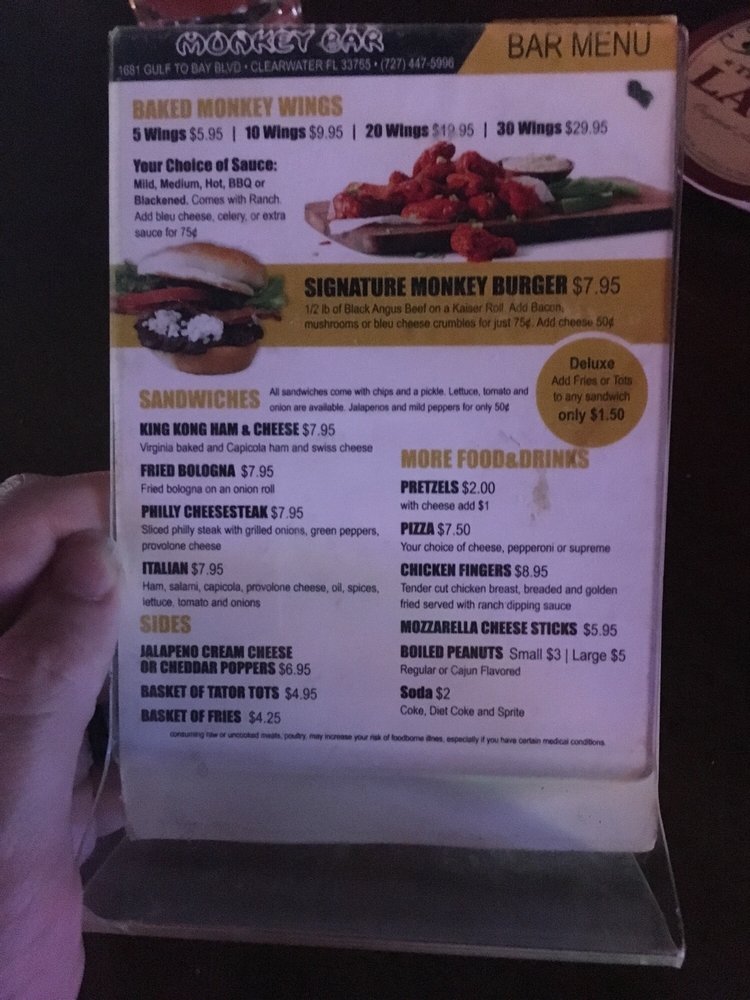 Introducing the menu at Monkey Bar of Clearwater, a hidden gem in the bar scene. Located at 1681 Gulf To Bay Blvd, this divey bar offers a range of utilities including outdoor seating, live music, and pool table, making it perfect for groups and fun nights out. Customers rave about the friendly atmosphere and fantastic service provided by owner Trish and bartender Jeff, who go above and beyond to ensure a great experience. From perfectly executed cocktails to delicious late-night food options like wings, Monkey Bar delivers on all fronts. Don't miss their signature jalapeño margarita and trust the regulars when they recommend the food. Overall, Monkey Bar of Clearwater is a must-visit spot for a night of fun, great drinks, and tasty eats.